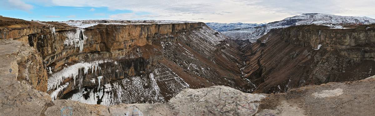 Со смотровой площадки (GPS 42.553516, 46.721629) у обрыва открываются восхитительные виды на каньон и водопад Итлятляр. Тобот отсюда не просматривается. Он немного правее внизу.