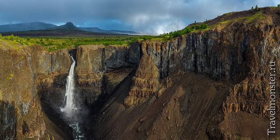 На заднем плане – водопад Итлятляр, падающий в каньон с Хунзахского плато. Цолотлинский каньон образован рекой Тобот, текущей по его дну. Но в Тобот впадает несколько рек и ручьев, падающих с отвесных стен ущелья. Одна из самых крупных из них, река Итля-Тляр, образует водопад Итлятляр.