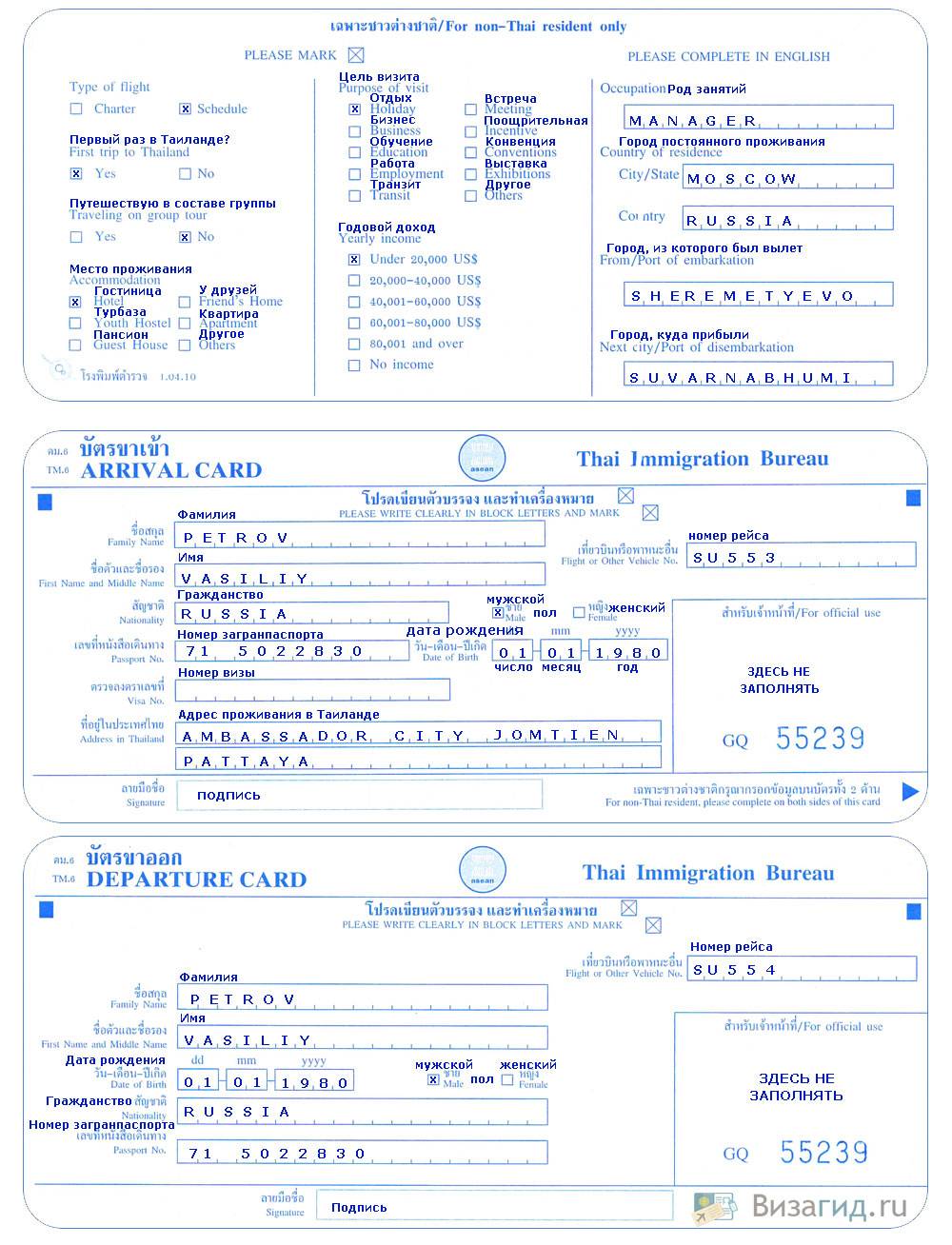 - Arrival card — прибытие в Таиланд. Эту часть забирает пограничник.