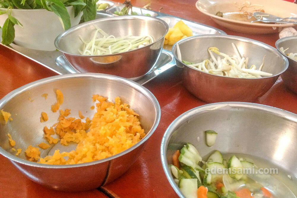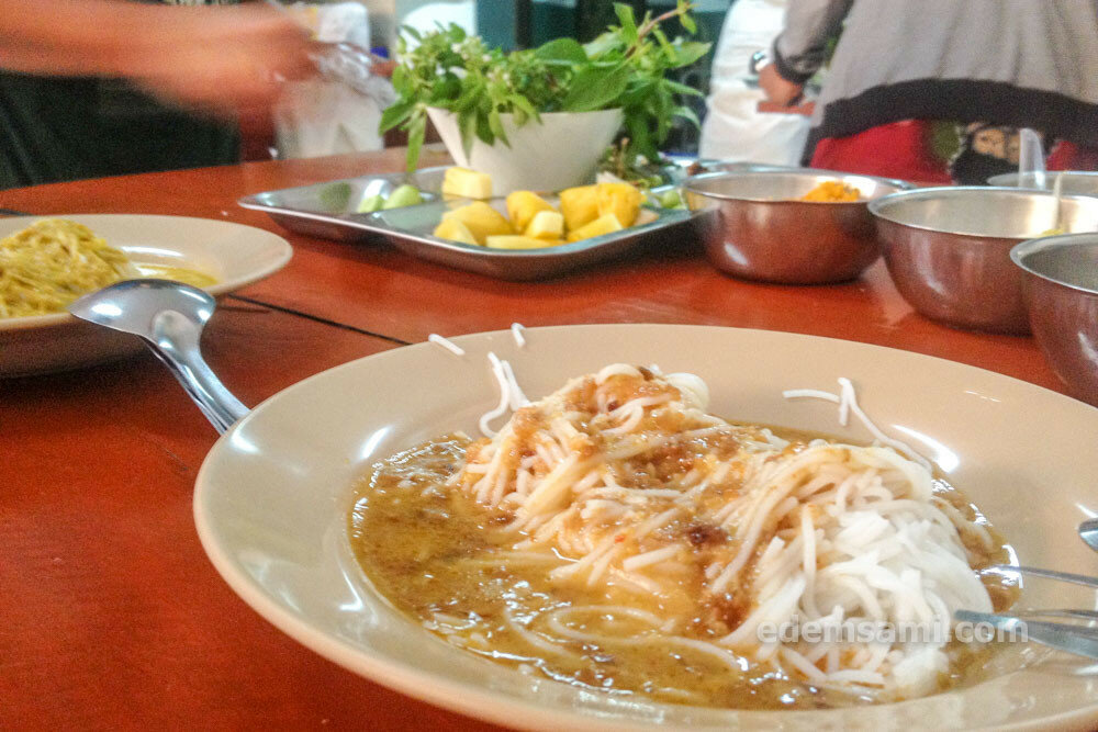 Не пугайтесь этой «самоделки»: собирать себе блюдо по вкусу не так уж и сложно. Смело берите тарелку с лапшой у специально обученной тетеньки и отправляйтесь к большим горшкам с карри. Выбирайте любое на свой вкус: сладкое ореховое, острое рыбное или рыбное с кокосовым молоком, усаживайтесь на любое свободное место и поглощайте в свое удовольствие, приправляя овощами и прочими дополнениями из корзинок и мисок на столе. Очень вкусно, очень дешево (40 батов с вариациями).