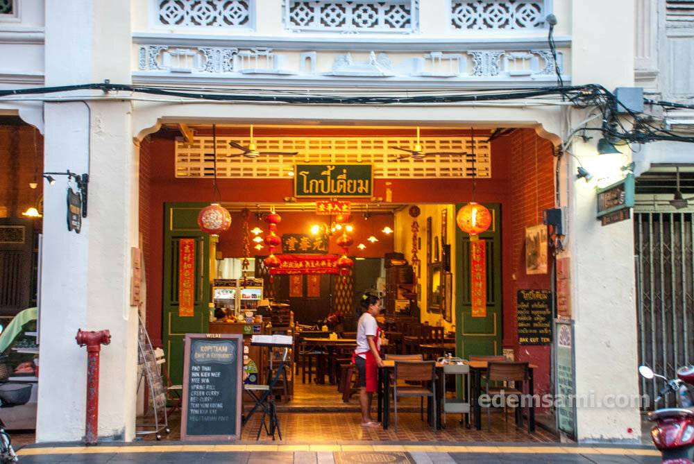 Если хочется чего-то более приличного, чем дешевая лапшичная или димсамная, то Пхукет-Таун, само собой, найдет, чем вас порадовать. По-крайней мере, мы точно порадовались. Казалось бы, что там может располагаться на Тхаланг-Роуд, кроме самой туристической попсы (Краби–Тхаланг и Яорават, сразу слева, если стоять спиной к Яорават)? И тем не менее, Kopitiam точно туристической попсой назвать нельзя. Атмосферно, аутентично, вкусно. Сразу после 6 вечера ресторан быстро заполняется народом, так что приходите либо чуть раньше, либо позже, когда столики начинают освобождаться.