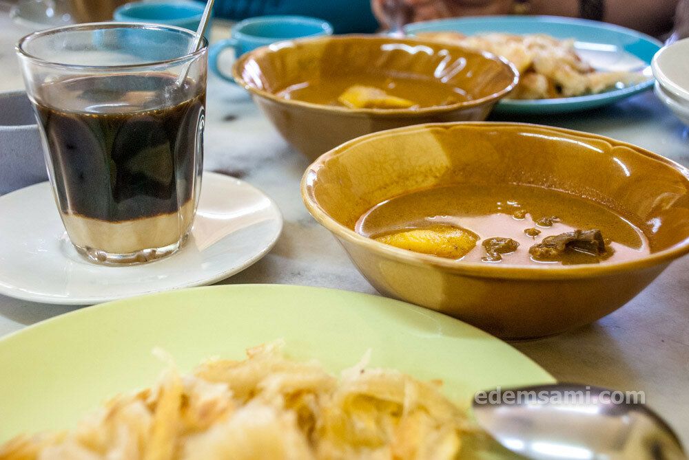 Обязательно закажите блинчики с карри – это солено-острый вариант, сладкие блинчики с бананом и яйцом к традиционному кофе со сгущённым молоком, и простые блинчики с сахаром или сгущенным молоком. Вариант с карри – на заглавном фото.