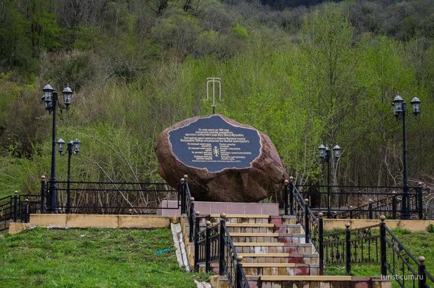 Отсутствие указателей и просто признаков какой-либо жизни тоже не добавляли оптимизма. Километра через два мы встретили какой-то объект с охранником, который на наш вопрос махнул на дорогу и предрек нам еще 3 км пути. Путешествие затягивалось, энтузиазм нашего мини отряда был уже на нуле, когда на нашем пути возник вот такой гранитный камень, который поведал нам, что когда-то здесь было поселение знаменитого адыгского рода Мугу.