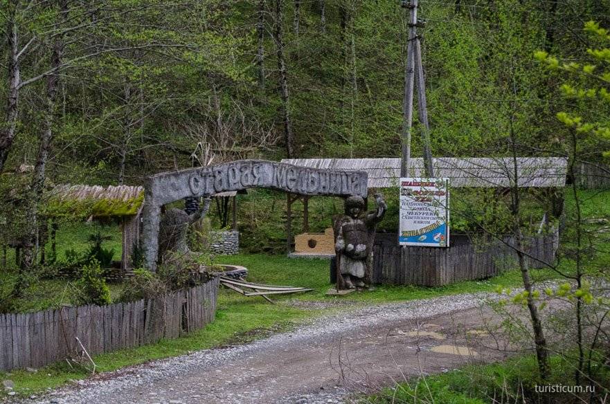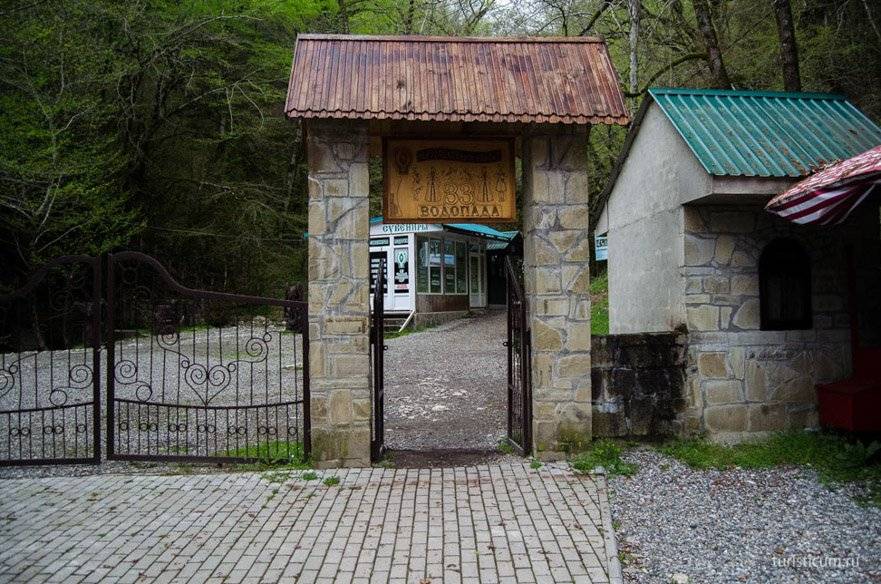 Не долго думая, мы нырнули в ворота слева с угрожающим знаком «Частная территория, проход запрещен.» Заводские резервуары слева и советские кирпичные строения, выкрашенные белой краской. Двое мужчин указали нам на ржавую калитку, пройдя через нее мы попали в цивилизацию. И тут наваждение рассеялось. Заводские резервуары оказались форелевым хозяйством, а дорога закончилась именно у 33 водопадов. Пройдя через ряды скучающих продавцов сувениров и домашних вин, мы оказались у цели нашего похода — достопримечательности 33 водопада.