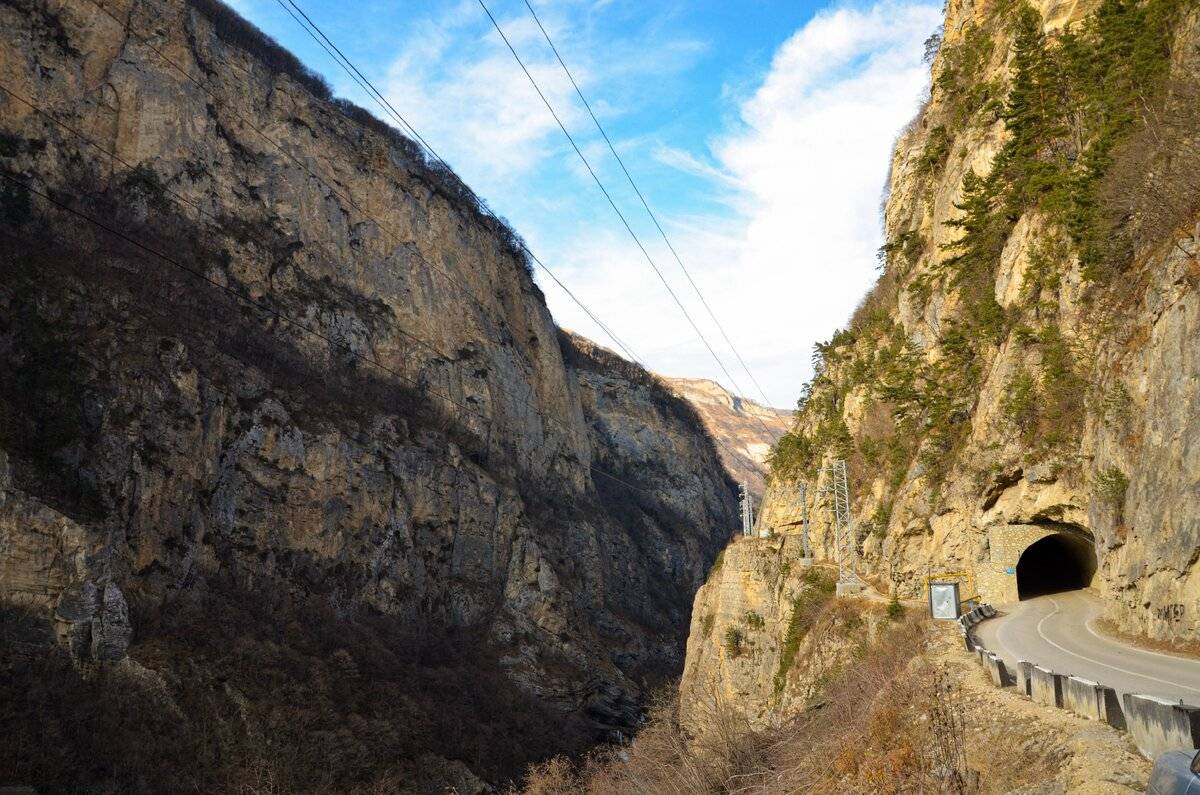 После знакомства с Церик-Кёль, мы направились вглубь Черекского ущелья. Здесь есть очень интересное место, которое называется «Рваная дорога». В 2008 г. в скалах пробили современные туннели, но вы можете пешком пройти по «Старой дороге». Для этого проезжаете два туннеля, и справа увидите сувенирные палатки. Оставляете авто там и пешком возвращаетесь назад. Вы увидите вырубленную в скале дорогу, которая проходит у самого края ущелья. Дорога построена в 1893 г. на средства Балкарского Горского общества силами жителей ущелья. Её строительство продолжалось почти 10 лет.