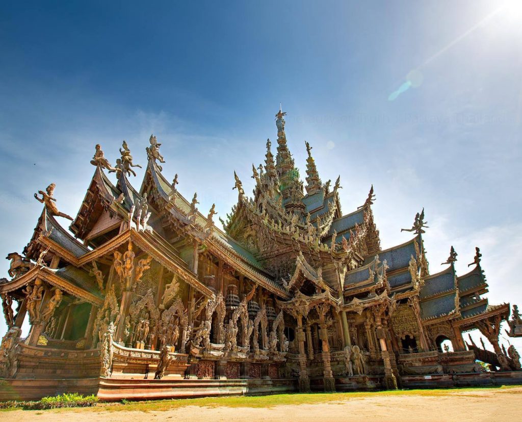 Великолепный деревянный Храм Истины расположен на берегу Сиамского залива. Его строительство началось в 1981 году и продолжается до сих пор. Окончание работ намечено на 2025-й. При этом культовое сооружение открыто для посещения.