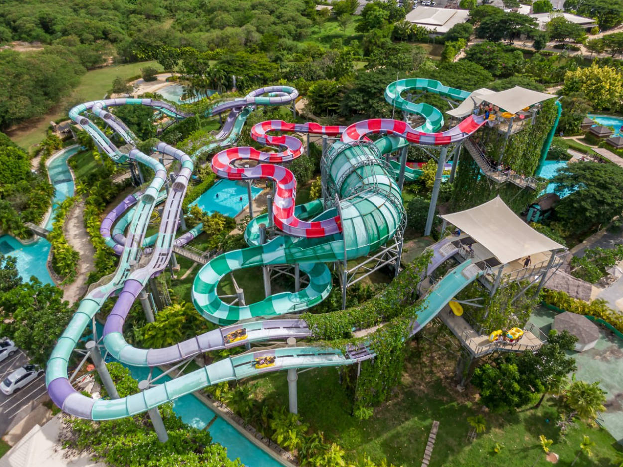 Семейный парк со скоростными водными горками, волновыми бассейнами, детскими зонами и плавучим рынком.