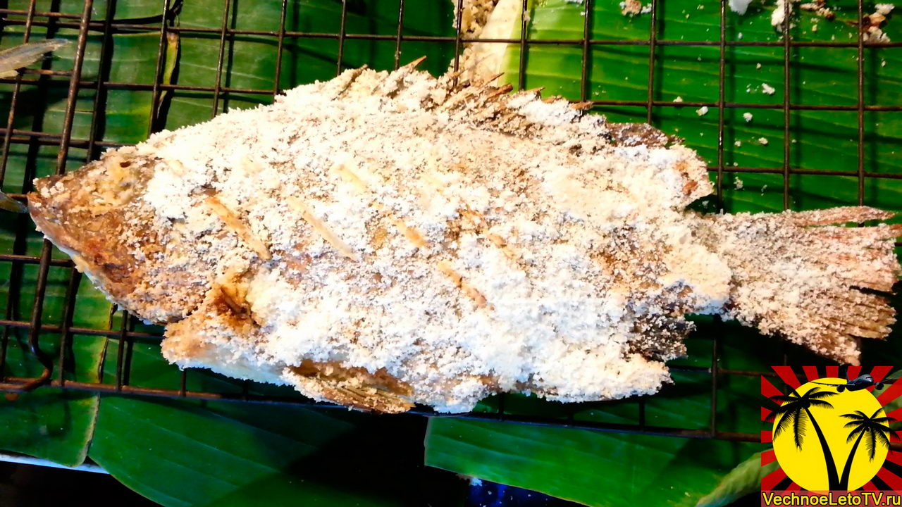 Рыба в соли. На первый взгляд, это блюдо не вызывает особого восторга. Ну рыба и рыба, но как только вы её попробуете, то поймёте, за что её так любят тайцы и туристы. Она готовится особым образом, при котором мясо получается очень нежным, сочным и в меру солёным. К рыбе подаётся лапша, соус и салат. Нереально вкусно.