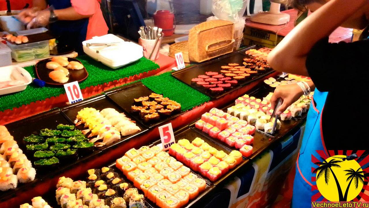 Роллы. Здесь они немного отличаются от роллов, которые делают в России, но тоже вкусно и выбор большой. По ценам 5 и 10 бат за штуку.