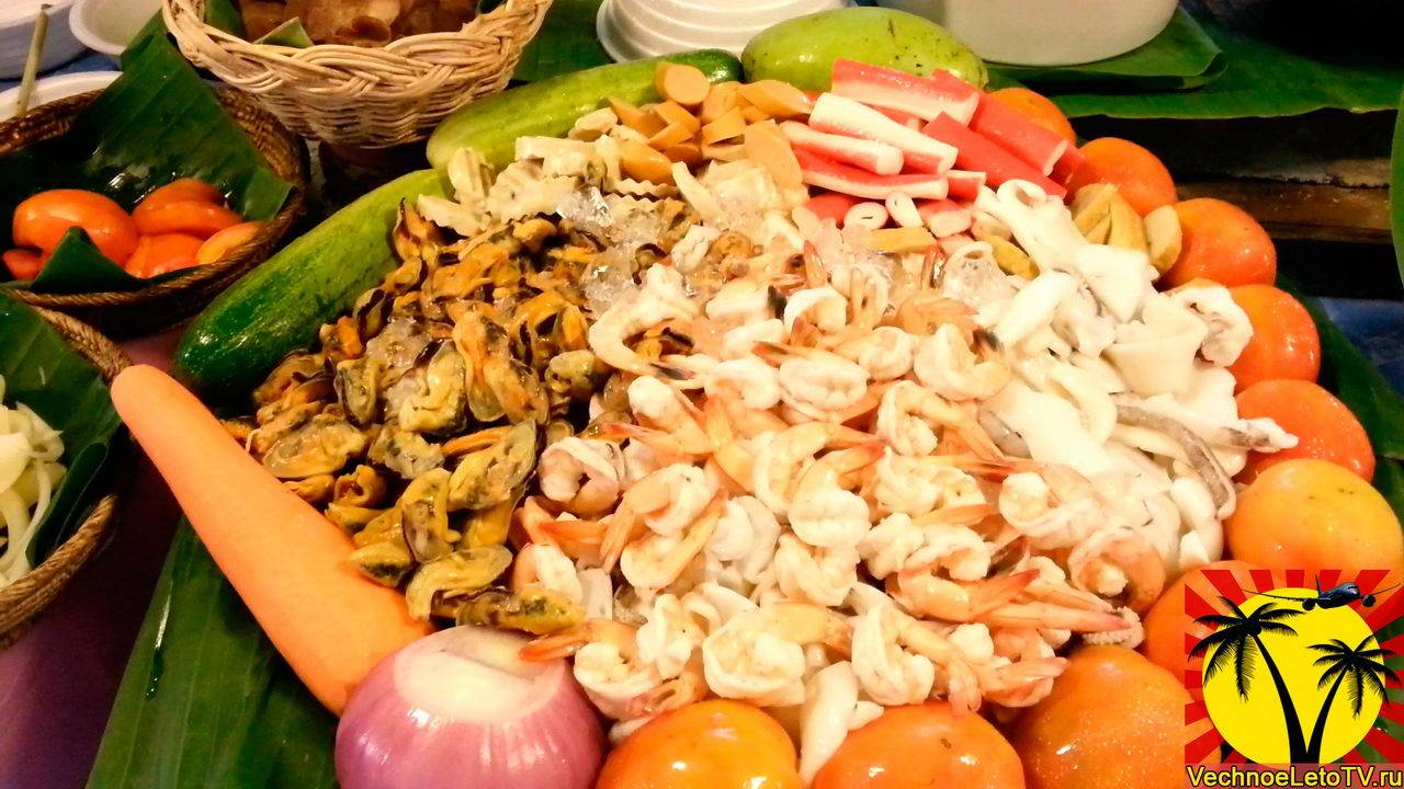 Конечно же тайская кухня не обойдется без морепродуктов, так как большая часть страны омывается морями. Здесь в изобилии различные блюда из морепродуктов: креветки, кальмары, осьминоги, рыба, лобстеры, устрицы и т.д. Рекомендуем вам обязательно попробовать, что-то из морепродуктов.