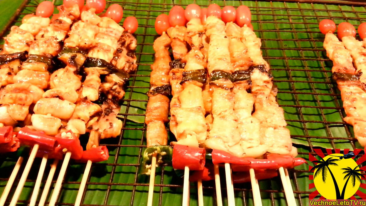 Шашлычки из рыбы, свинины или курицы. Стоят недорого, всего 20 бат за шашлык. Очень часто, помимо мяса, на шпажку насаживают различные овощи.