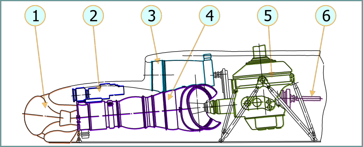 Во время работы вспомогательной силовой установки атмосферный воздух будет всасываться при помощи компрессора через сетку и радиально-круговой вход. В компрессоре имеется три ступени, после прохождения которых воздух сжимается и подается в кожух газосборника. Отсюда основная масса отобранного вещества поступает в камеру сгорания. Оставшаяся часть может перепускаться в улитку выхлопного патрубка и через выхлопной патрубок выводиться обратно в атмосферу, а может и поставляться потребителю.