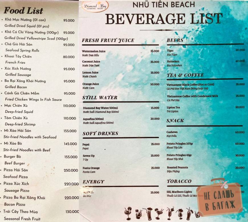 На территории пляжа есть ресторан. Здесь есть большой выбор алкогольных напитков по бутылкам, закуски и морепродукты. Ресторан выглядит весьма уныло из-за отсутствия туристов. Морепродукты здесь побоялись взять, но купили картошку фри(80.000 донгов за порцию с размером с ведро и 30.000 донгов за Tiger 0.3).