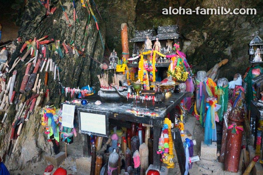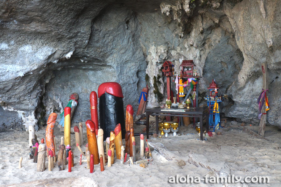 — также оставленный в пещере фаллос якобы способен уберечь рыбаков от участи мужа несчастной женщины Пра Нанг… Напомню, её муж утонул во время шторма, так и не вернувшись с рыбалки. Поэтому рыбаки оставляют духу Пра Нанг свои подарки, чтобы она их защитила в море;
