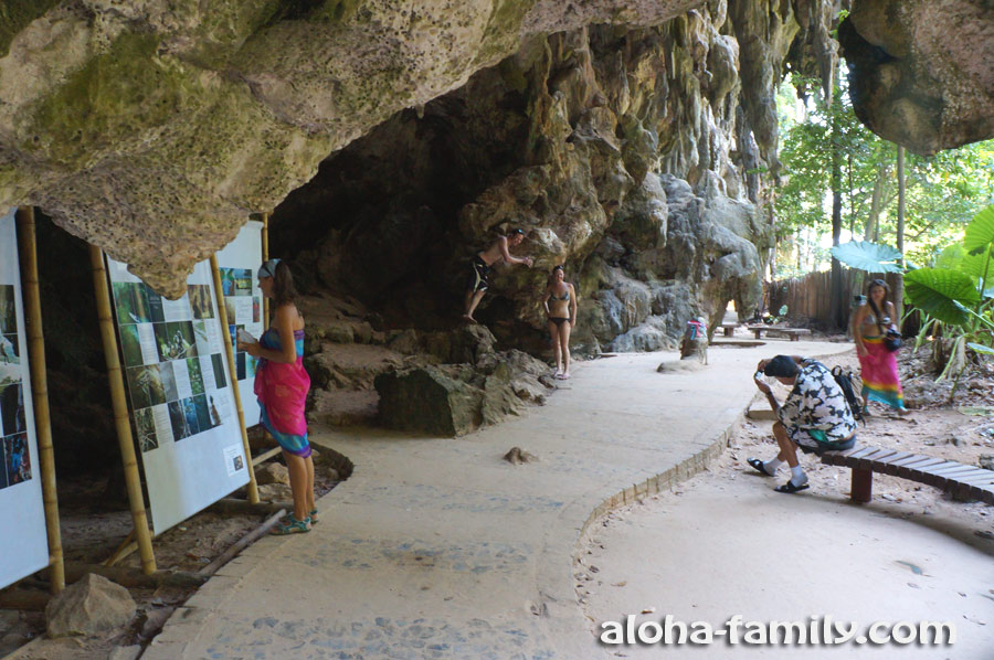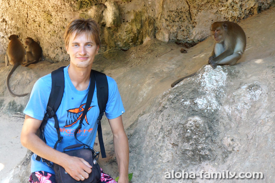 По дороге мы увидели стенды с описанием истории провинции Краби, легенд пляжа Прананг, а также бегло просмотрели и пофоткали инфу про флору и фауну Андаманского моря и побережья и про необходимость защиты окружающей среды. По пути к пляжу нас не переставали удивлять окружающие тропу углубления, пещеры, сталактиты, нависающие над головами скалы… Также мы встретили озорных обезьянок.