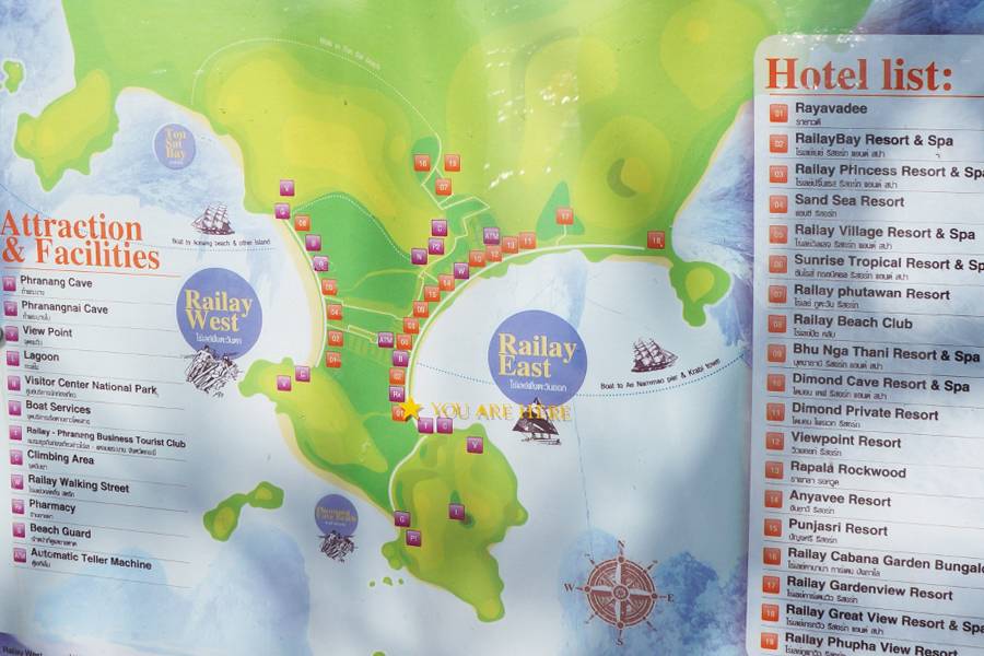 На карте пляж Прананг находится южнее всех (маленький синий кружочек внизу). Вы можете заметить, что от пляжа East Railey к нему ведёт тропинка, обозначенная на карте белой полоской. С этой тропинки, проложенной вдоль живописных навесных скал, есть поворот налево в гору — так можно попасть на смотровую площадку и озеро под названием Лагуна. В жаркий сезон озеро пересыхает, а горная тропа весьма неприступна. К тому же с нами был пожилой человек, который 100% полез бы на гору вместе с нами, что было небезопасно… Так что карабкаться на смотровую площадку мы не стали, и направились чётко к пляжу Прананг.