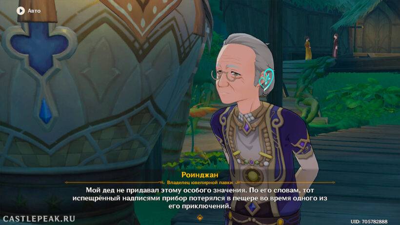 Увидев покупку, Джазари скажет, что это обычное ядро хаоса. Торговец воспротивится, и скажет, что это ядро хаоса из стража руин в логове Ужаса Бури, и что на нём даже есть след Волка Севера. Раритет всего Тейвата! Паймон вовремя вспомнит, что ядро хаоса из того самого стража забрал Дайнслейф. В итоге Джазари упомянет дедушку торговца, от чего тот станет несколько мягче. Однако, нужного устройства у него всё равно не находится.