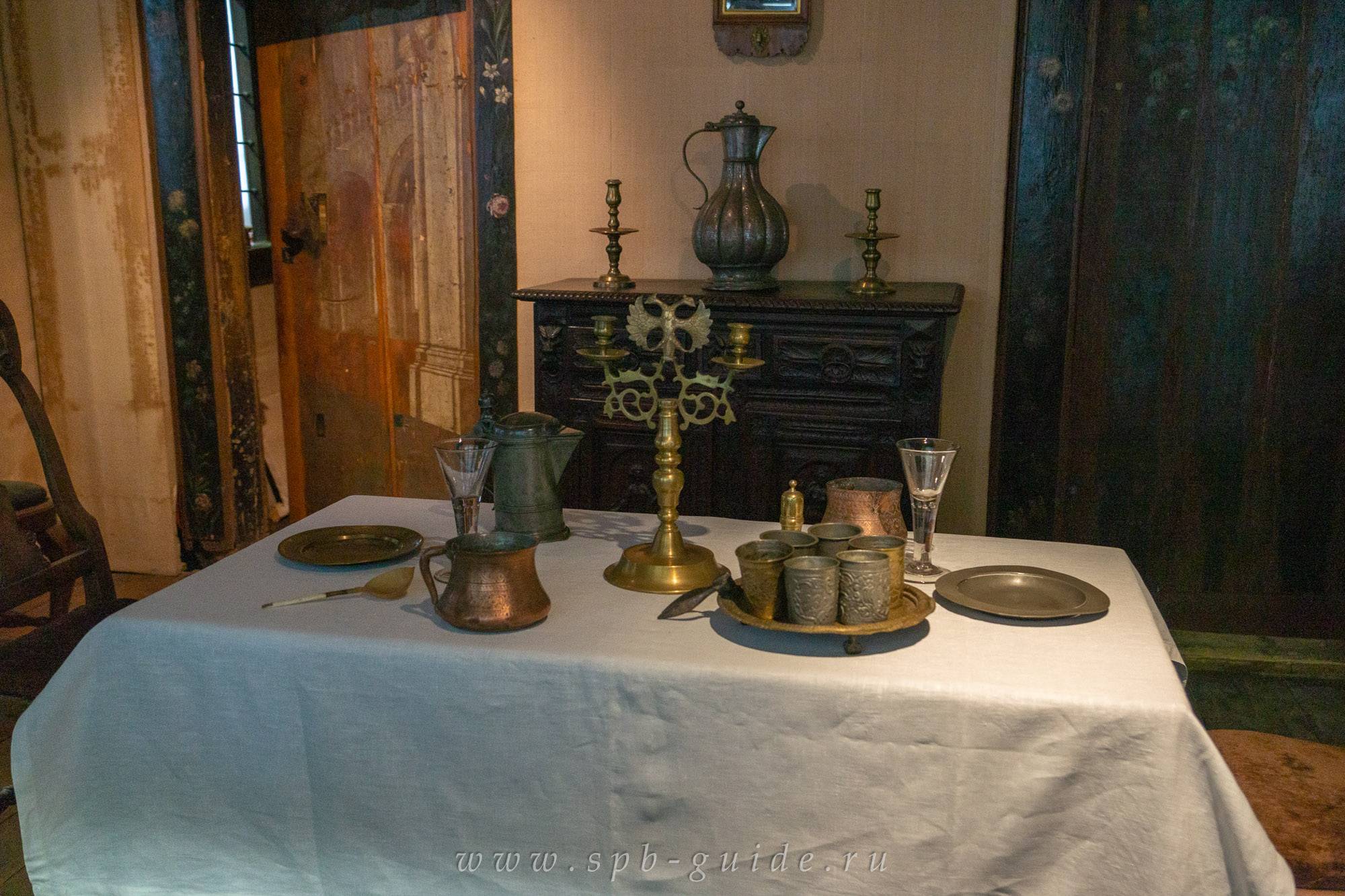 А так же современный и высоко технологичный, по тем временам, умывальник. Кровать, где спал Пётр не сохранилась и в комнате стоит ещё сундук, но не попал в кадр. Следующая комната это столовая. В столовой воссоздана обстановка XVIII века.