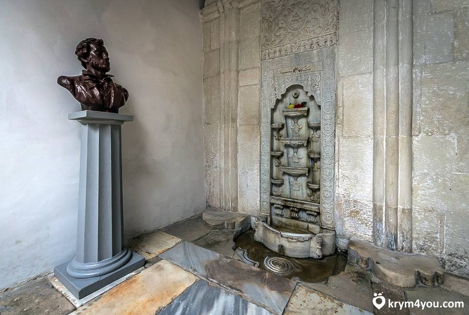 Одной из красот Ханского дворца является фонтан Слез, который находится в фонтанном дворике. Существует легенда, что хан встретил девушку и влюбился в нее всем сердцем.Но она умерла совсем молодой. Тогда хан приказал соорудить фонтан, в память о своей возлюбленной. Он хотел, чтобы не просто стекала вода со стены и придворный мастер сделал невозможное — заставили сам камень плакать, как плакала душа.хана. Автор вырезал на мраморной плите цветок лотоса, из которого капали редкие, скупые слезы хана. Слезы перетекали из больших чаш в маленькие и так до бесконечности. Но Пушкин А.С. трактовал все по-своему в поэме «Бахчисарайский фонтан»,написанной в 1822 году.