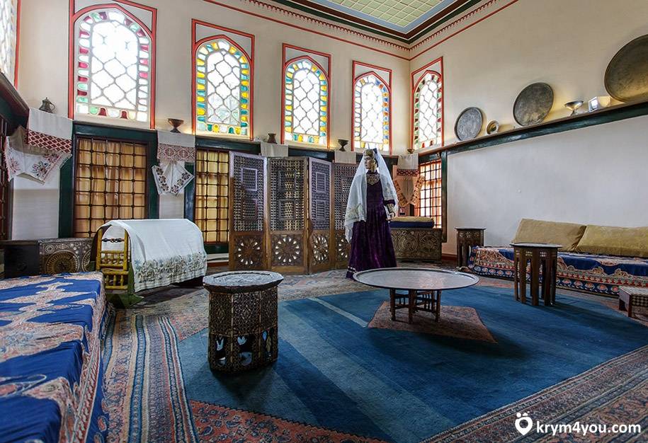 На территории гарема всегда проживало четыре официальные жены хана. Окна комнат жен были украшены своеобразными жалюзями из железа с узорами, которые позволяли девушкам наблюдать за двором, но их не было видно.