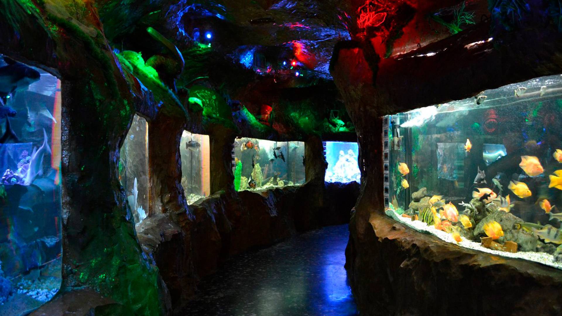 - На первом этаже находятся панорамные аквариумы, которые оснащены яркой и цветной подсветкой. За его стенками плавают рыбы, черепахи, креветки, обитатели Атлантического и Тихого океанов.