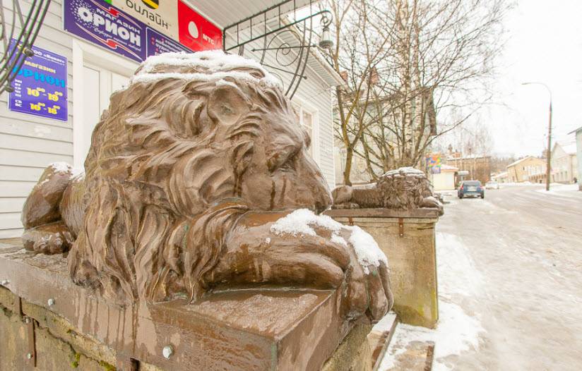 Однако на пороге посетителей встречают два каменных льва. Пышногривые хищники лениво развалились по обе стороны от небольшой лестницы и дремлют, свесив лапы с постаментов. Скульптуры напоминают о близости городка к блистательной Северной столице.