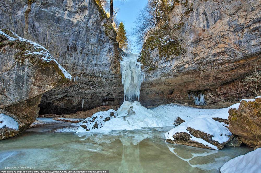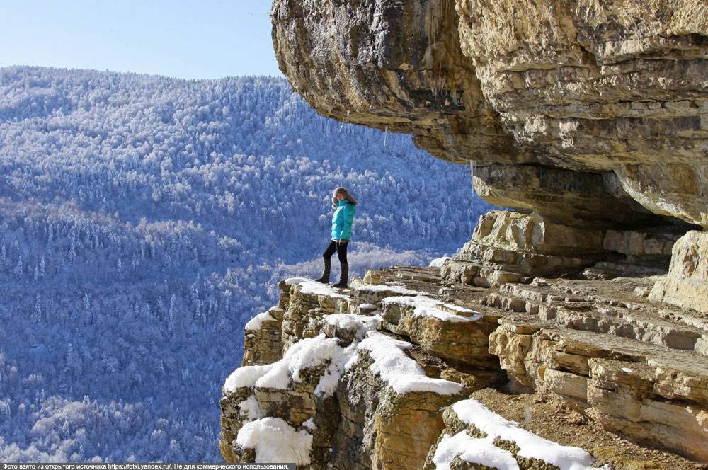 Например, пейзаж, открывающийся с 300-метровой высоты Орлиной полки, поражает бархатисто-белым великолепием лесов, сплошь покрытых снегом. А Курджипское ущелье подле Мезмая зимой превращается в чертоги ворчливого старика Мороза и капризной красавицы Снегурочки – вокруг виднеются заледеневшие валуны, лианы и укутанные снежной периной тисосамшитовые рощи.