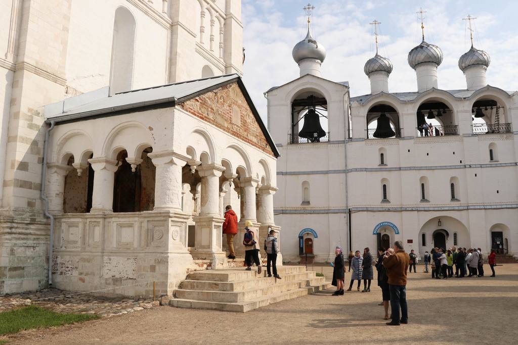 У главного собора невозможно не заметить внушительную звонницу. Масштабные и старинные колокола известны далеко за пределами Ростова, а их перезвон считается на редкость гармоничным. На звонницу можно подняться, чтобы увидеть комплекс и озеро Неро сверху.