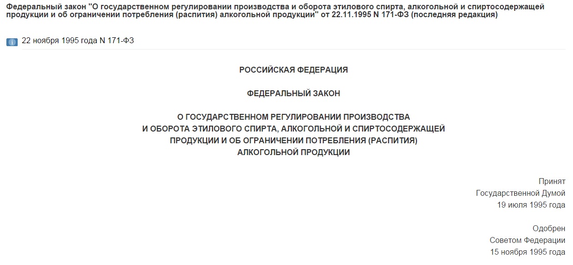 Главным федеральным законом, устанавливающим требования к производству и розничной продаже алкоголя является 171-ФЗ от 22.11.1995 года «О государственном регулировании производства и оборота этилового спирта, алкогольной и спиртосодержащей продукции…». В статье 16 данного Закона перечислены особые требования к розничной продаже алкоголя населению. В пункте 9 данной статьи указано, что на федеральном уровне запрещена продажа алкоголя с 23 часов вечера до 8 часов утра следующего дня по местному времени. Данное ограничение сразу назвали своеобразным аналогом «сухого закона» в российском исполнении.