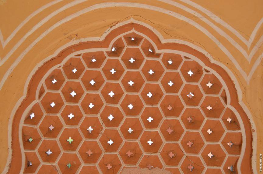 Многие могут ошибочно посчитать, что все жены махараджи жили в этом дворце, однако, если посмотреть на Хава-Махал в профиль, то становится заметно, что ширина этого грандиозного здания не превышает 15 метров. На самом деле, дворец является чем-то вроде театра. Махараджа выстроил дворец для того, чтобы его жены могли наблюдать за торжественными процессиями, проходящими в городе. Ревнивец не желал, чтобы кто-то еще смотрел на его жен, а потому в стенах вы не найдете ни одного окна больше человеческой головы — в этом и состоит главная особенность дворца. Вместо окон стена испещрена множеством смотровых бойниц и искусственных щелей, образующих своеобразную сеть из пустотных узоров. Эти бойницы не только скрывали от чужих глаз гаремы махараджи, но и создавали великолепную вентиляцию, охлаждающую Хава-Махал в жару. Чем сильнее жара — тем сильнее струятся потоки воздуха. Довольно часто в коридорах дворца бушует самый настоящий ветер, который и дал название Хава-Махалу.