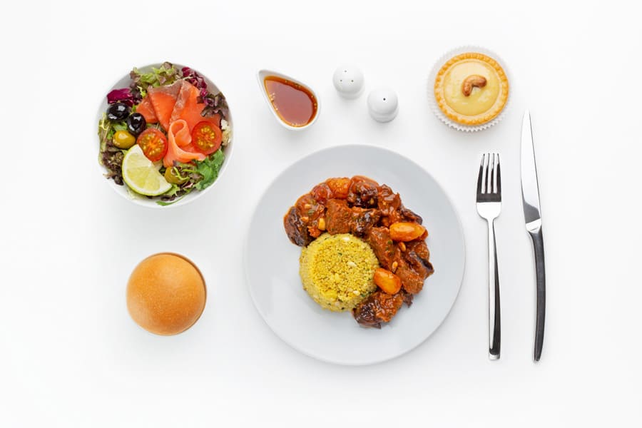 Состоит из говядины по алжирски с пилавом из кускуса. Нарезка из семги, помидоров, оливок в апельсиновой заправке. Булочка, пирожное. Без содержания свинины, желатина и алкоголя.