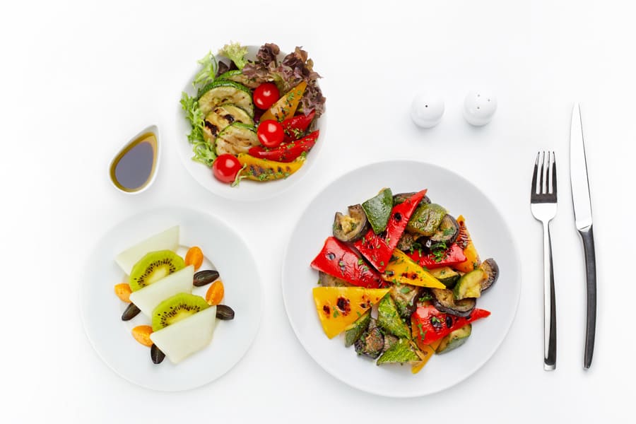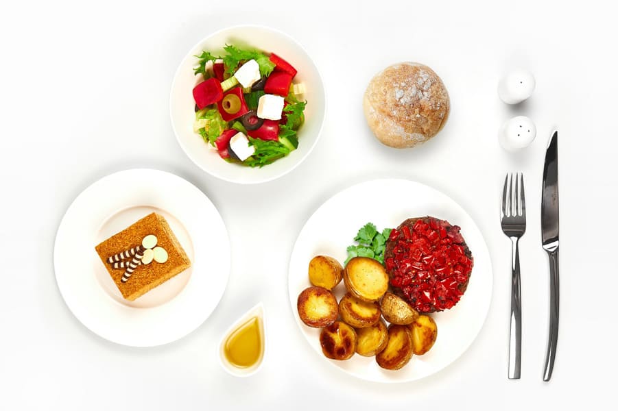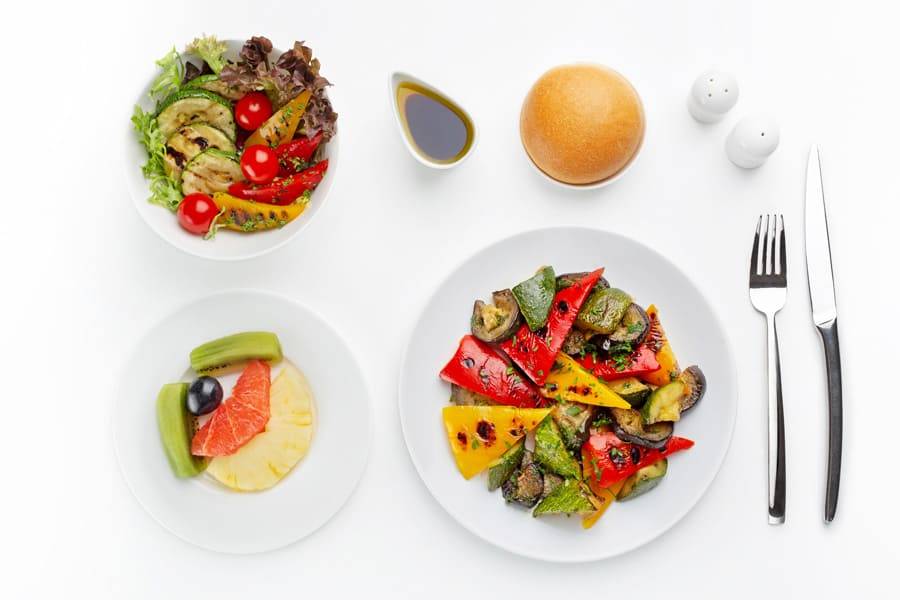 - Вегетарианское меню — хлеб (отдельно упакован), овощной и фруктовый салат, кетчуп, горячее блюдо без мяса, джем.