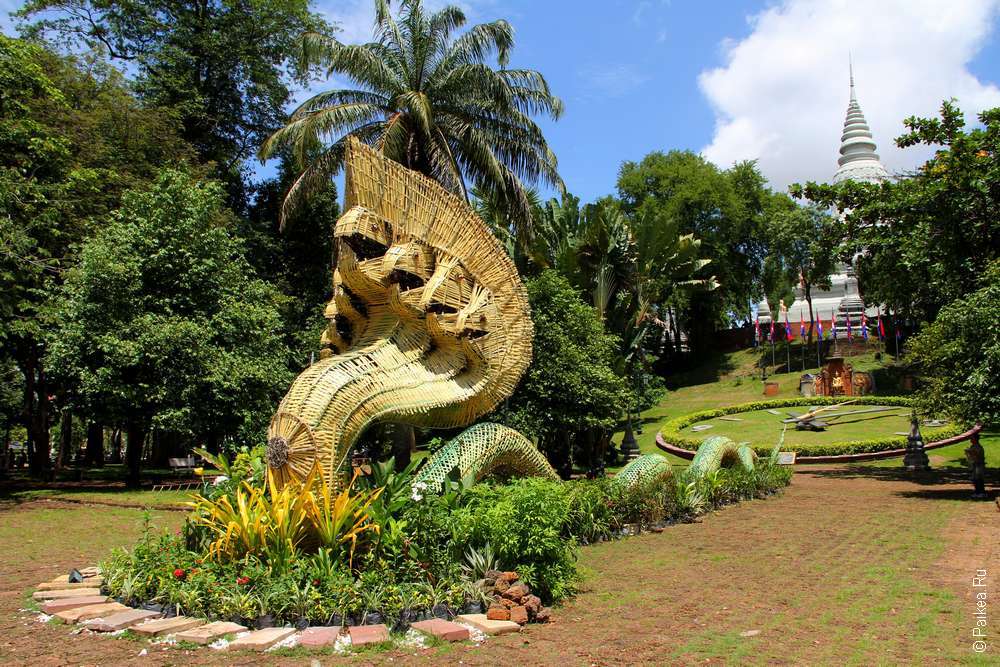 Начинаем нашу прогулку у ступы главного храма Пномпеня и сразу видим семиголового нага у подножия холма