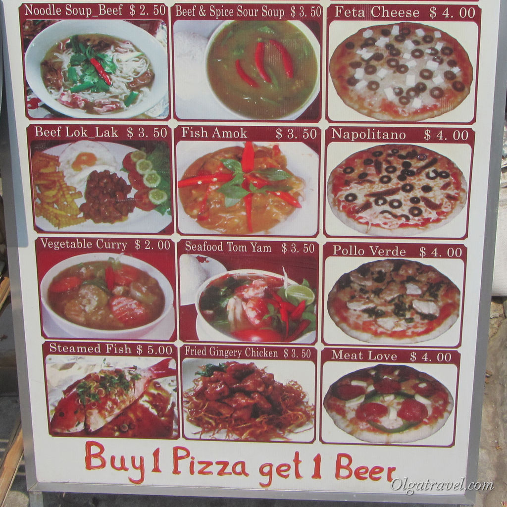 С кафе в Пномпене проблем нет. Рядом с набережной куча ресторанчиков, где предлагают блюда как кхмерской, так кухни разных стран мира. Много пиццерий, китайских, японских ресторанов, баров с дешевыми коктейлями. Цены на еду немного выше, чем в Сиануквиле.