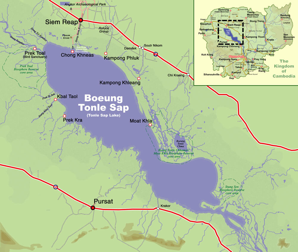 Неподалеку от Сием Риапа, минутах в тридцати езды от центра на тук-туке, находится еще одно место достойное посещения – самое большое в Юго-Восточной Азии пресноводное озеро. Слово Тонлесап переводится как «Большое озеро», и оно действительно таковым и является, с одного берега другого не видно (3.000 км2 зимой, 10.000 км2 — летом). Уникальные особенности этого озера защищают Камбоджу от наводнений, поскольку во время паводка (май-сентябрь) великая азиатская река Меконг сбрасывает свои воды именно в Тонлесап, который выступает в данном случае в роли своеобразного аккумулятора. Примерно со второй половины сентября уровень воды в Меконге и озере выравнивается, а в остальное время года вода из озера, наоборот, сливается в Меконг.