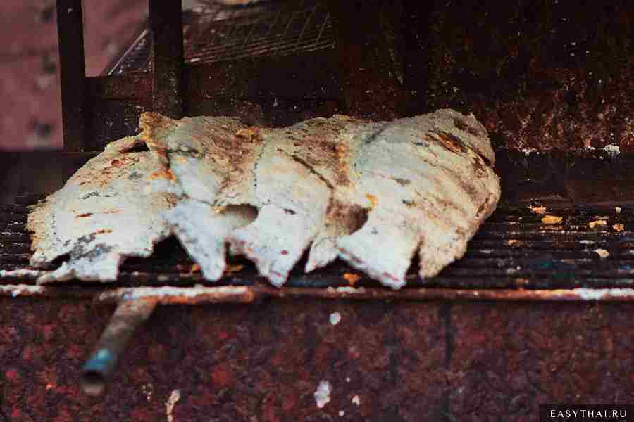 Это очень вкусное и популярное блюдо у любителей рыбы и морепродуктов. Тайцы готовят только свежую белую рыбу, которая до момента приготовления может плавать в чане. Её хорошо обваливают в соли, начиняют пальмовыми листьями и другими травами, которые придают ей особый вкус. Мясо рыбы получается очень нежным. Как правило, подают ее с рисовой лапшой или рисом, острыми соусами и большим количеством зелени. Зачастую можно брать одну рыбу на двоих.