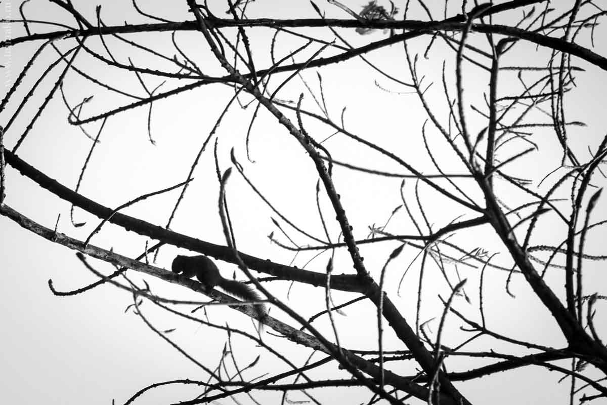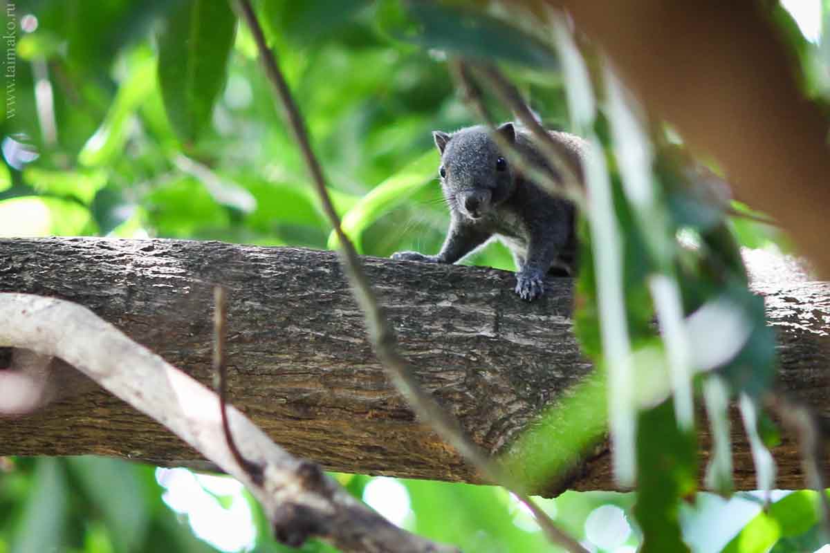 Как я уже говорила, мы практически постоянно сидим на балкончике, наблюдаем за всем, что происходит вокруг. В какой-то момент мы заметили пугливое существо, легко передвигающееся по веткам дерева. В отличие от муравьёв и тараканов, оно держалось от нас на приличном расстоянии и сначала даже трудно было разглядеть — кто это.