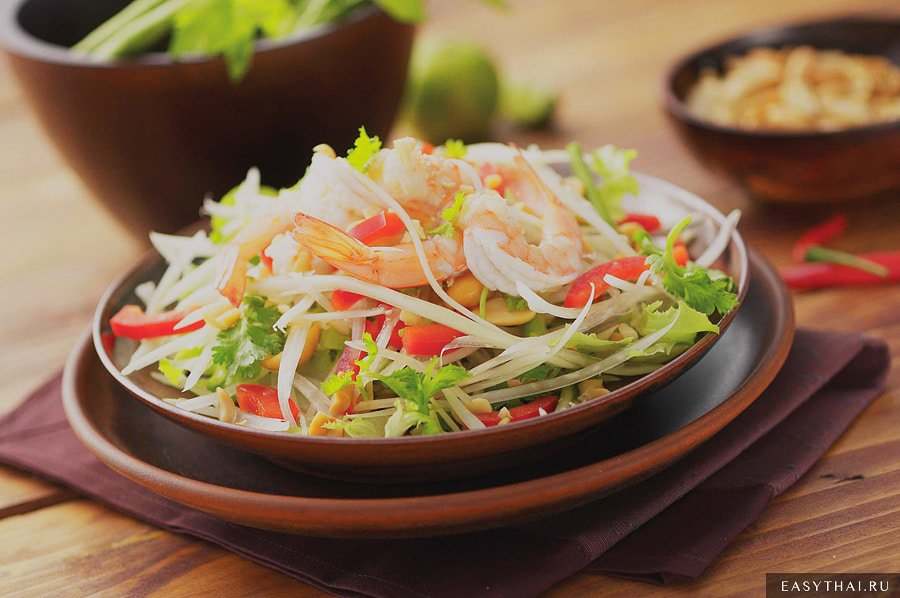 Сом Там – это довольно острый салат, основу которого составляет зеленая папайя, небольшое количество моркови, длинных бобов, также жареный арахис, соусы и специи. Все это довольно долго мнется в ступе, отчего папайя становится мягче, а сам салат – сочнее. Сом Там часто подается с крабами или креветками. Особенностью этого салата является то, что он сочетает в себе 4 вкуса: кислый, сладкий, острый и соленый. Наверное, поэтому он стал популярным не только в Таиланде, но и во всем мире. Сом Там входит в 50 самых вкусных блюд мира по данным CNN за 2011 год.