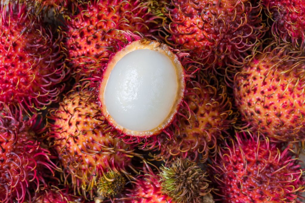 Рамбутан — тропический фрукт родом из Таиланда. Плод красного цвета и имеет волосатую внешнюю поверхность. Мякоть фрукта белая и содержит большую смечку. Этот уроженец Таиланда не только вкусен, но и красив на вид. Красная, волосатая внешность фрукта скрывает сладкую, белую мякоть внутри.