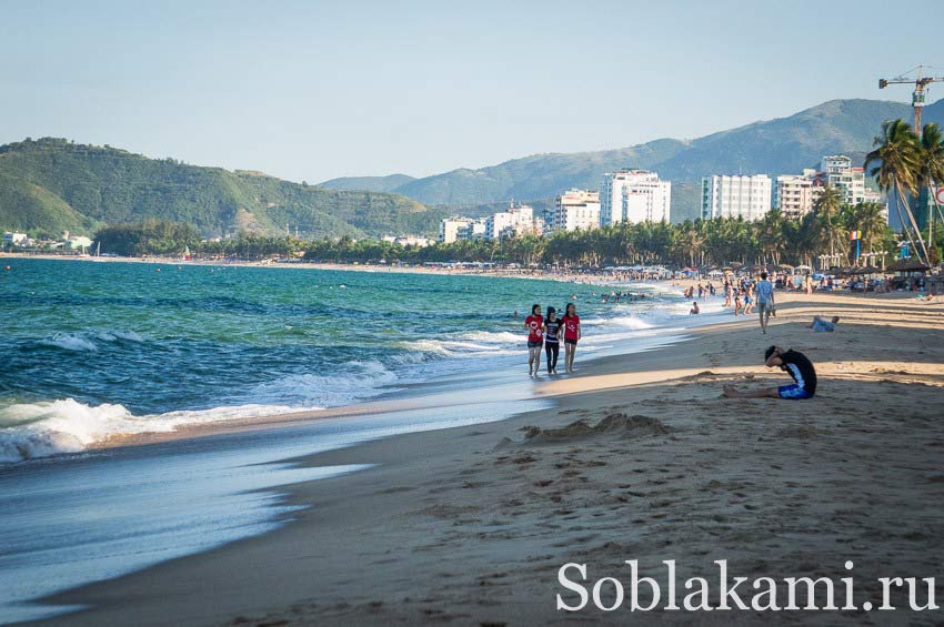 Городской пляж Нячанга – вытянутый, с широкой береговой линией. Есть густонаселенные места рядом с ресторанами и пляжными клубами, а есть участки, где вокруг вас никого не будет на расстоянии 100-200 метров. Мы жили в недорогом отеле возле Шэратона, платили 7 долларов в сутки за номер на троих и наслаждались почти пустынным пляжем, на котором днем было очень мало народу. К вечеру туда подтягивались после работы местные жители и становилось многолюдно.