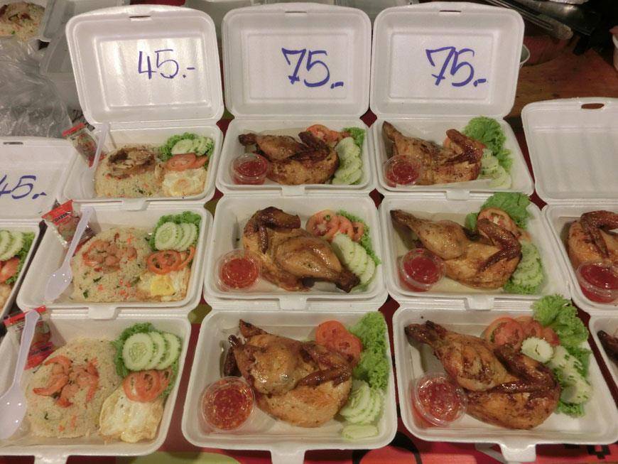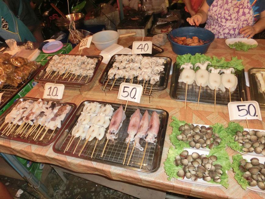 Вы, наверно, не раз видели огромное количество лоточков и кастрюлек с готовой, необычной едой? Выбор подчас настолько огромен, что просто глаза разбегаются от этого изобилия, но учитывайте, что все эти блюда приготовлены для тайцев, поэтому могут показаться для вас слишком острыми. Один пакетик с едой обойдется вам, в среднем, в 30 бат, поэтому за одну прогулку вы можете легко попробовать все, что захотите. По дороге вы встретите палатки не только с готовой едой, но и свежей рыбой, мясом, курицей или морепродуктами ( самые популярные, бесспорно, кальмары и креветки ). Особенно богат выбор морепродуктов на рынке, расположенном на улице Наклуа.