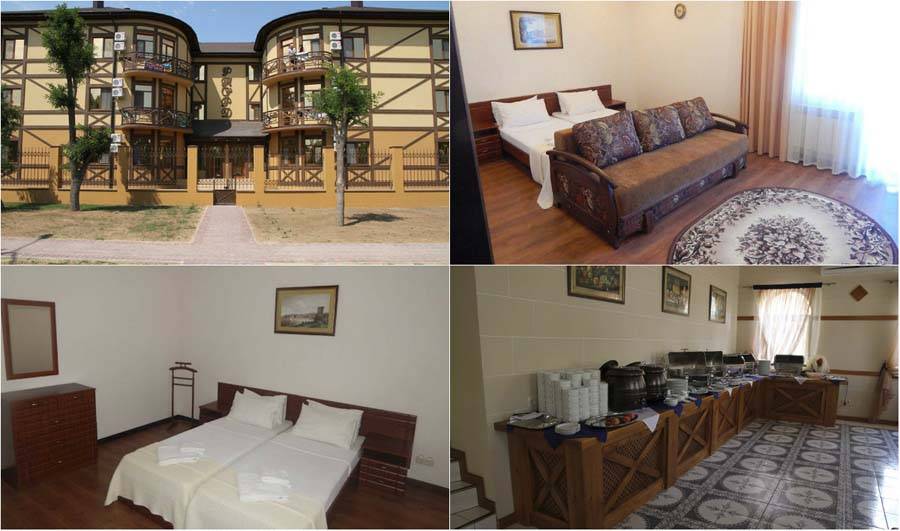 расположена на косе между морем и соленым озером Сиваш. До благоустроенного песчаного пляжа не более 300 м. Но в центр города придется добираться на авто или общественном транспорте. Остановка находится буквально в нескольких минутах ходьбы от отеля. Гости могут проводить время у бассейна или на уютных верандах. В столовой можно заказать комплексное питание или по желанию питаться по меню. Немного удручает отсутствие зелени. Однако, видно, что хозяева стараются: везде разбиты цветочные клумбы. Даже небольшую площадь владельцы стараются использовать под функциональные объекты. Например, детскую площадку.