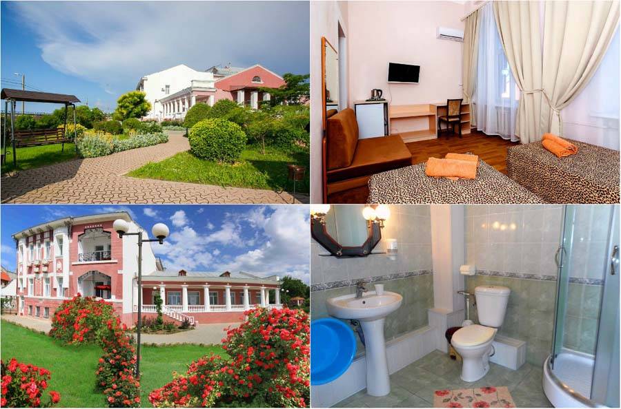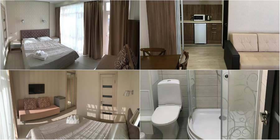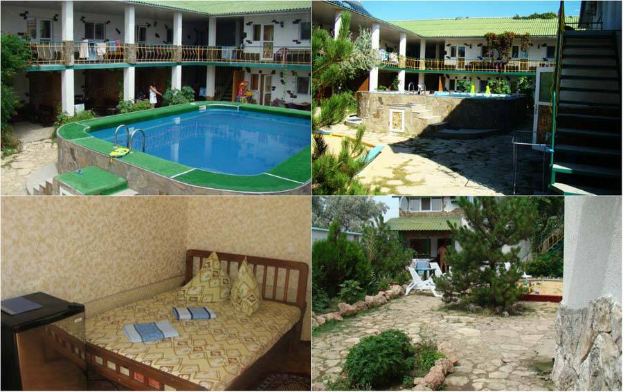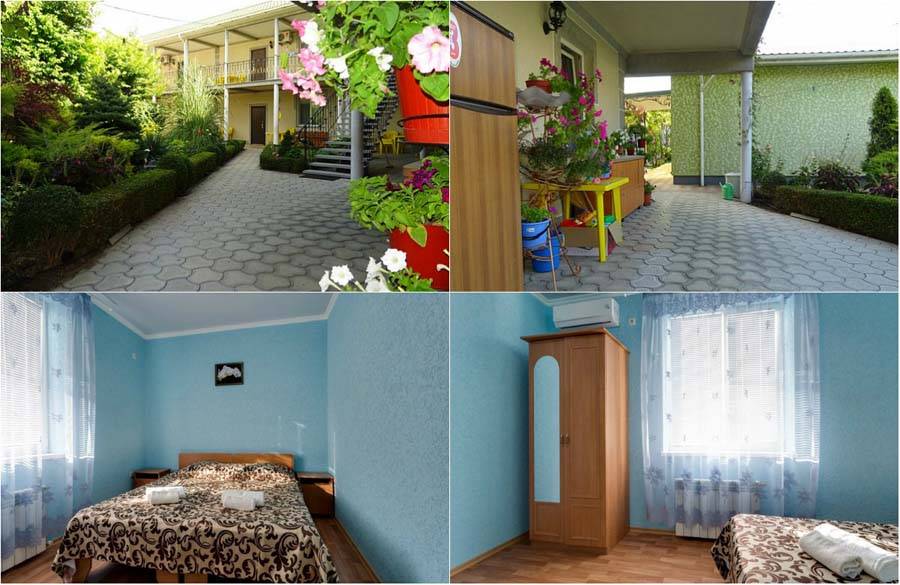 Предлагает гостям провести отпуск в просторных номерах «студио» или двухкомнатных номерах. Здесь есть все необходимое для отдыха. Комнаты оборудованы сплит-системами, телевизорами. Есть кухонная мебель, необходимый набор посуды, электрический чайник. Для отдыха гостям доступны террасы на втором этаже, столики со стульями для каждого номера на веранде первого этажа, беседка рядом с площадкой для барбекю. Мы отдельно хотели отметить обилие зелени во дворе. Удобно и местоположение. Гостиница расположена в центре Евпатории. Рядом находятся магазин, кафе, аптека, остановка общественного транспорта. До песчаного пляжа и Набережной города 10-15 минут неспешным шагом. Из недостатков мы бы назвали небольшую, всего на 3 автомобиля, парковку, и отсутствие игровой зоны на территории. Снять жилье дешево можно на месте, многие агенства в интернете берут высокую комиссию. Советуем договариваться с хозяевами уже по приезду, найти их можно по ул. 13 ноября.
