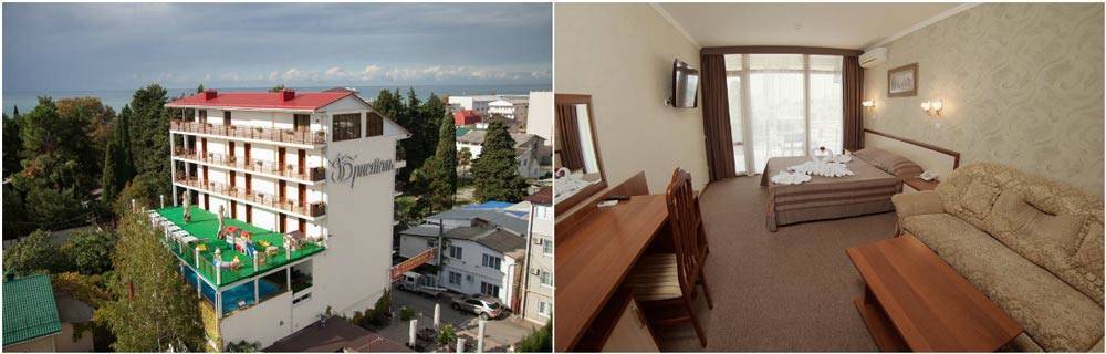 Каждому клиенту предоставляется комплимент от отеля. Цены на проживание могут меняться в течении сезона. Поэтому, номер на двоих с телевизором, кондиционером и балконом стоит 3200, 5300, 4400 рублей в июне, августе и сентябре соответственно. Главным достоинством этого места является близость к пляжу.