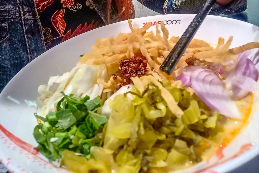 Во-первых, это кхао сой, знаменитая северная лапша. Ее можно найти и в других местах, но тут она очень хорошая, и размер порции солидный. С куриной ножкой – 70 батов, со свининой – 80 (мне нравится именно со свининой).