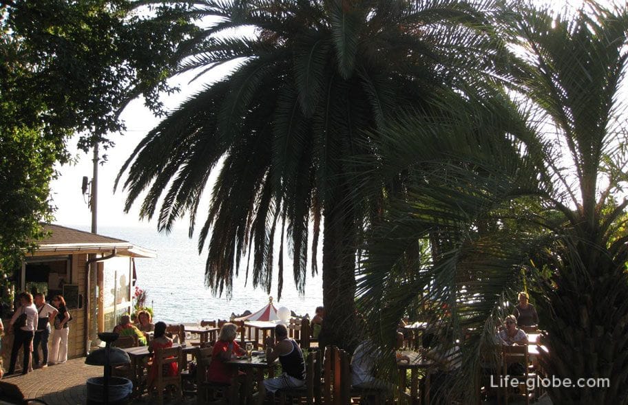 - >«У пальмы». Кафе расположено на ул. Приморская, 19А. Принимает посетителей с 10:00 до 22:00. Заведение имеет весьма аутентичный вид. Множество деревянных столиков располагается прямо под открытым небом, недалеко от большой пальмы. В меню кафе представлены традиционные блюда кавказской кухни. Цены начинаются от 200 рублей за блюдо.