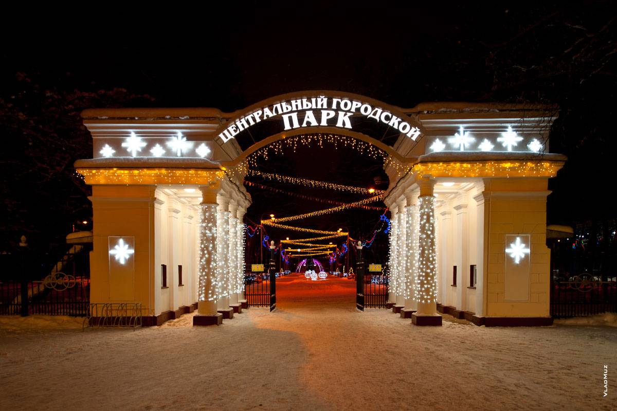 HD-фото входа в Центральный городской парк в городе Королёве Московской области зимой перед Новым годом