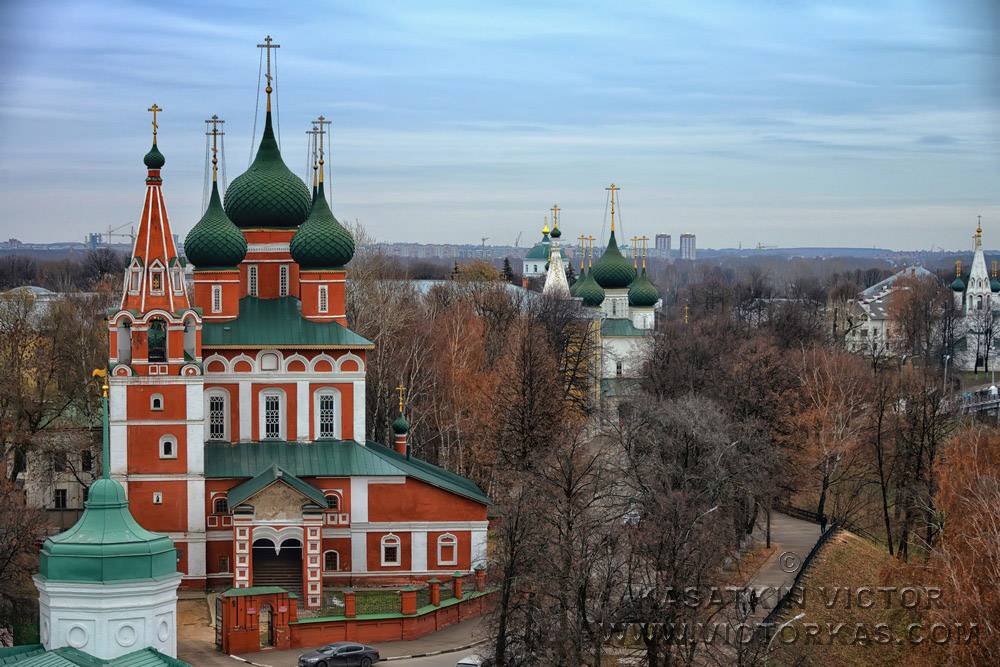 А вот Ярославль мне сразу понравился. Красивый, богатый храмами и церквями, парками, дорожками, историей. Если у вас всего два дня, и вы хотите посетить «Золотое кольцо», приезжайте в Ярославль, не пожалеете. Даже достаточно промозглая погода не повлияла на мои впечатления от этого города. Когда мы посещали Кремль, я поднялся на башню, чтобы сделать панорамные снимки, да и вообще посмотреть на город. Так вот, только в ближайшем поле зрения я насчитал 11 церквей и храмов, не считая Кремля.