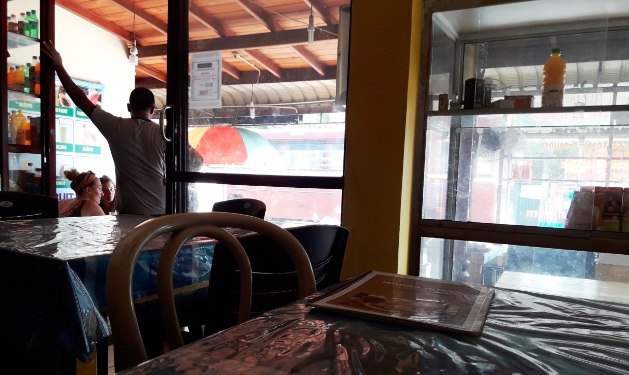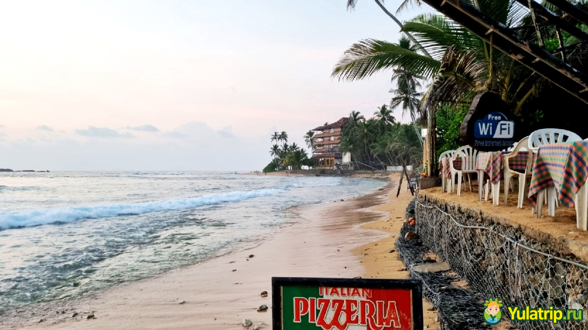Берег Хиккадувы усеян общепитами. Вот только сложно сказать, что из заведений есть что-то приличное. Какие-то непонятные радужные зонтики и красные пластмассовые стулья – основные приметы кафе в Хиккадуве. Имеется на берегу русское кафе, где даже умудряются готовить борщ. Хозяин этого кафе – русский пенсионер, уже много лет проживающий на берегу океана. На трассе тоже очень мало приглядных заведений, чтобы поесть. Открыто лишь пару китайских забегаловок с ужасной едой и вот с такой панорамой.