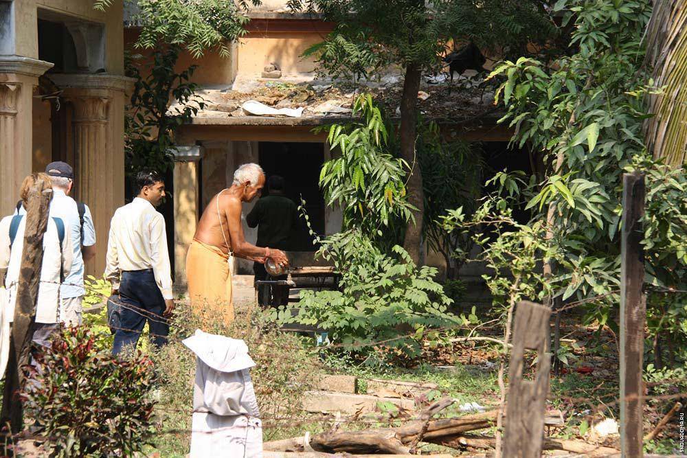 Брамин с женщиной сидят на полу внутри этого магического квадрата. Он произносит мантры, она повторяет. Остальные брамины суетятся рядом, заканчивают свои приготовления. Женщина принесла для них новые белые лунги, они удаляются переодеваться. Переодеваются прямо среди колонн рядом с богами, затем возвращаются, рассаживаются на полу и – начинается…